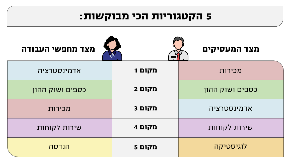 חמשת התחומים שזכו להכי הרבה ביקוש מצד המעסיקים, אשר התבטא בכמות המשרות המפורסמות, הם: במקום הראשון תחום המכירות (10%+ משרות ביחס לאותה תקופה בשנת 2024), במקום השני קטגוריית כספים ושוק ההון (10%+), אדמיניסטרציה (10%+), ולאחריו שירות לקוחות (15%+) ולבסוף תחום הלוגיסטיקה (12%+). מתוך הקטגוריות המובילות הללו, המקצועות הכי מבוקשים מצד המעסיקים היו: נציגי שירות לקוחות, אנשי ונציגי מכירות, תפקידי "בק אופיס", מנהח"ש ומוכרים קלאסיים.